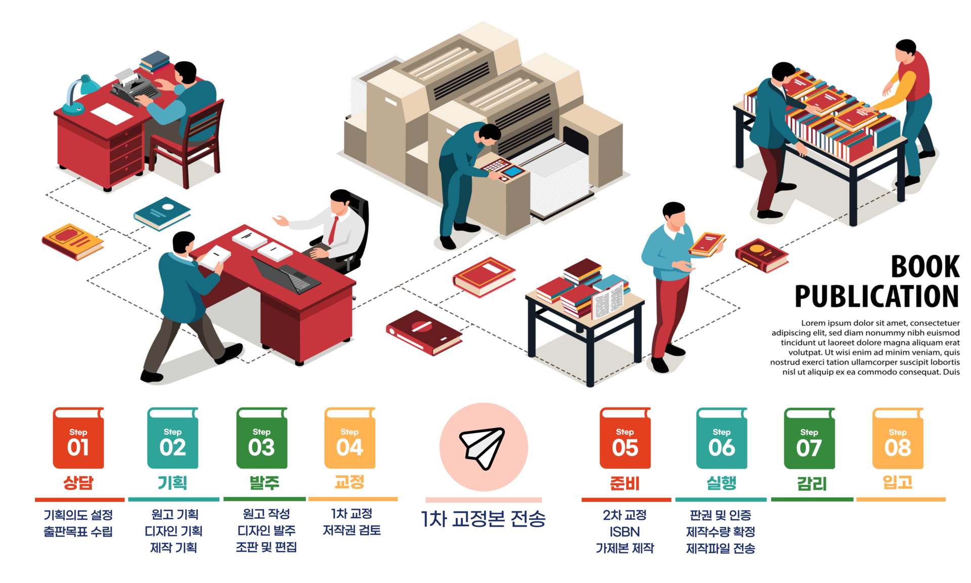 제작물의 원고 및 디자인 기획이 진행되는 단계에서는 그림 및 표지, 컬러, 조판, 재질 등의 세부적인 실무사항 등이 함께 고려되어야 합니다.